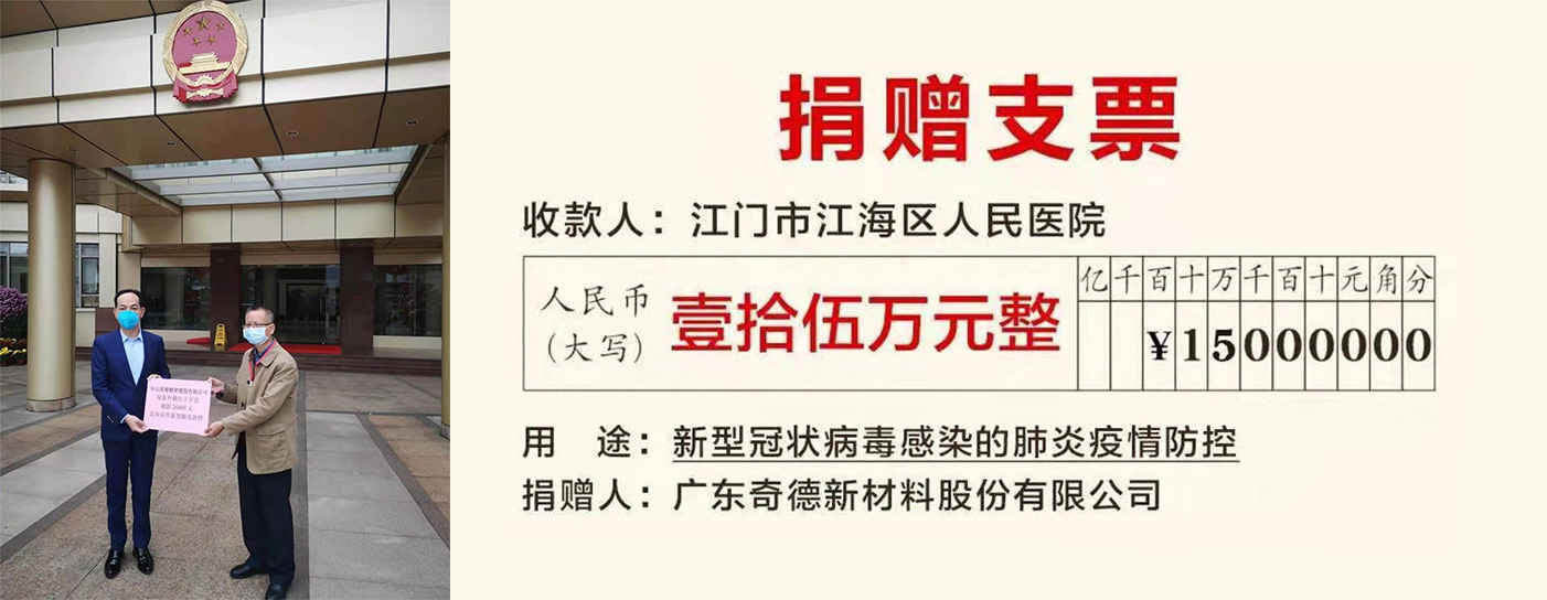 当董事长得知江门江海区出现新冠疫情时,江海区人民医院作为区定点新型冠状病毒医疗机构,医院严重匮乏医疗防护用品时,立即决定将2019年捐赠给江海区慈善会的30万,其中15万定向捐赠江海区人民医院用于抗击新冠病毒。